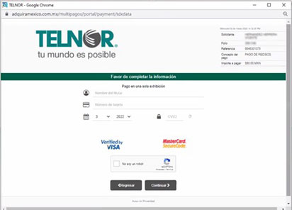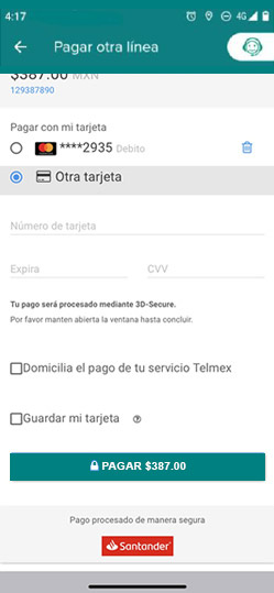 Paso 4. En esta pantalla aparecerán las tarjetas guardadas o si lo requieres puedes agregar una nueva; además, puedes seleccionar domiciliación de tu servicio Telnor y guardar la tarjeta.