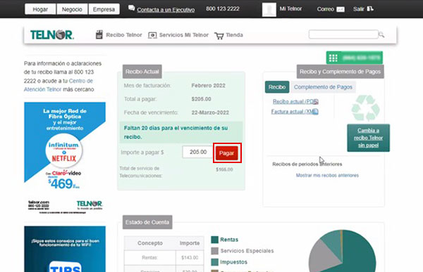 Paso 3. Se mostrarán los datos de la Línea Telnor: monto a pagar y mes a pagar, haz clic en el botón PAGAR.