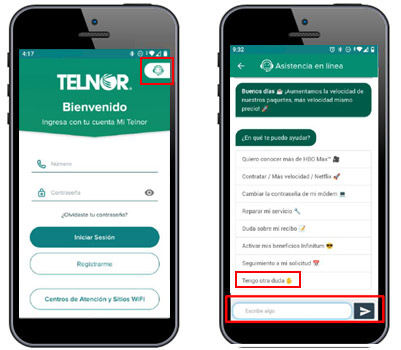 En caso de tener algún inconveniente para abrir o mantener una conversación con el Asistente Virtual te sugerimos borrar el caché de tu celular. Si tu dispositivo es Android, dirígete a la sección de Ajustes > elige Aplicaciones > selecciona App Telnor > da clic en Almacenamiento > elimina datos y caché. Para iOS es necesario desinstalar la aplicación y volver a instalarla o puedes comunicarte al 800 123 2222