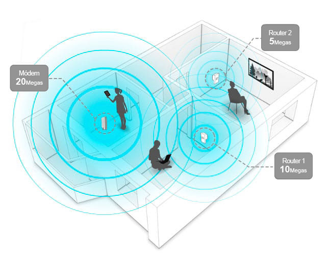 Este módem encuentra la señal que está dentro de su radio de cobertura, la regenera y retransmite para que llegue a tus dispositivos. Es recomendable para conexiones menores a 5 Megas